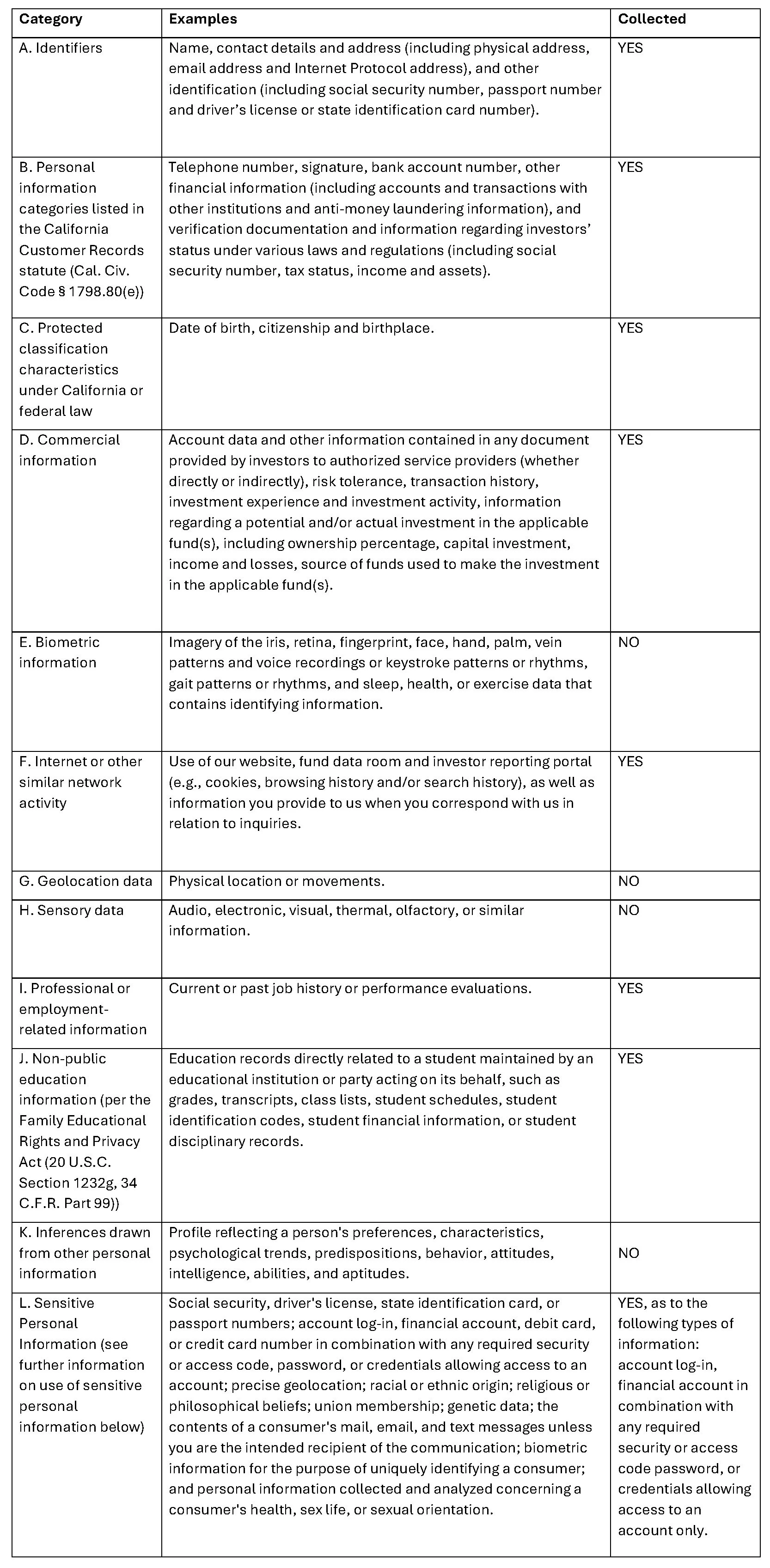 We collect limited types of personal information through our website and investor reporting portals, as well as through other electronic communications (e.g., emails), as applicable (collectively, the “Website”). The types of personal information we collect about you depends on the nature of your interaction with us. The categories of personal information we have collected from individuals on this Website over the last twelve (12) months include the following: