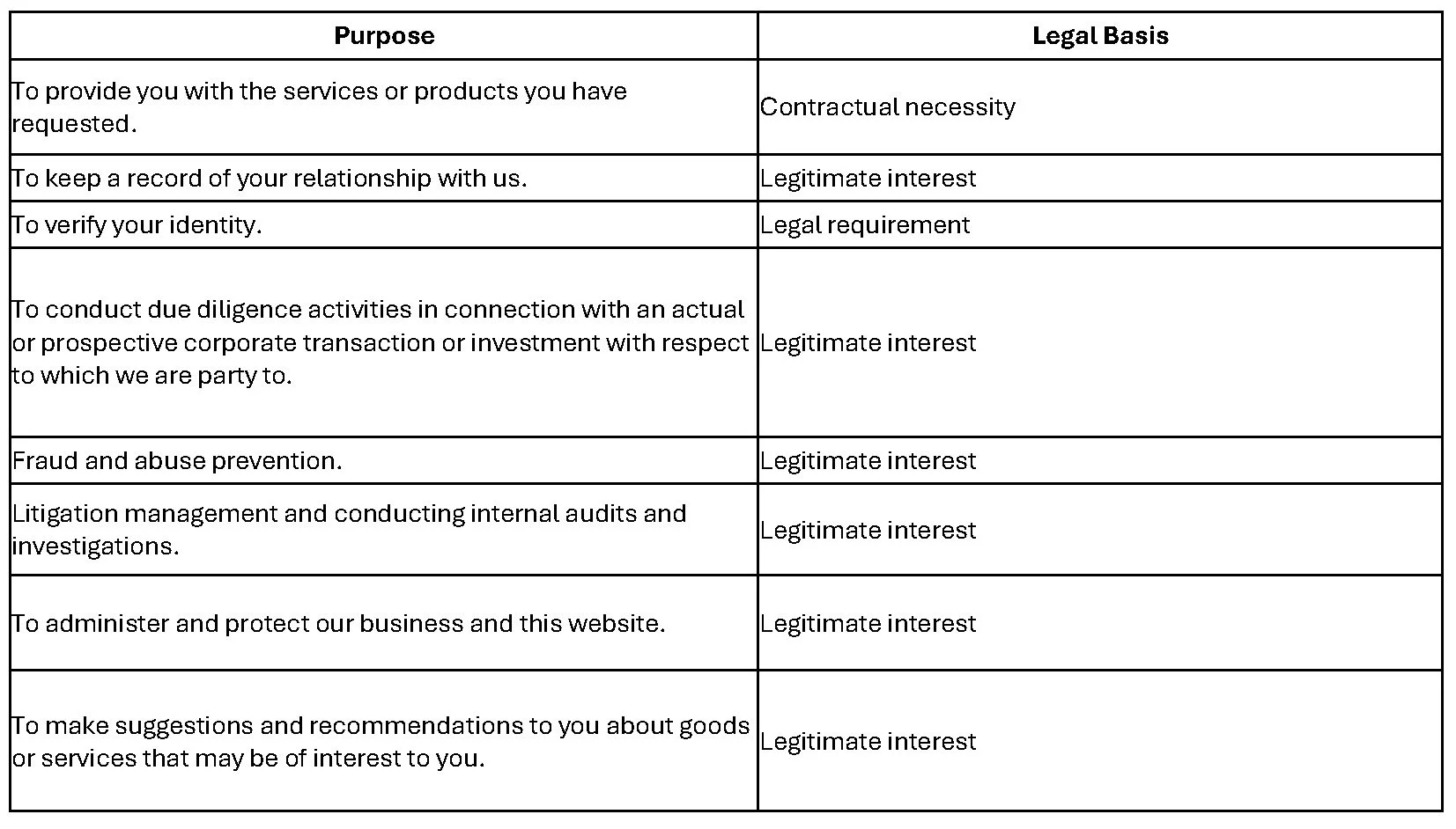 We rely on various legal bases under applicable data protection legislation in order to process your personal information (e.g., name, title, address, email, marital status, date of birth, IP address, financial data, username, password, etc.), including our legitimate interests, contractual necessity and as required by law. We use the personal information we collect to operate our business and provide you with the services and products we offer and perform essential business operations. We do not collect any special categories of personal information about you (this includes details about your race or ethnicity, religious or philosophical beliefs, sex life, sexual orientation, political opinions, trade union membership, information about your health and genetic and biometric data). Nor do we collect any information about criminal convictions and offences.